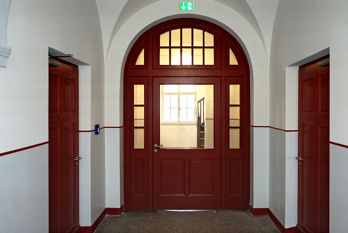 Brandschutzverglasungen können auch mit Brandschutztüren kombiniert werden.